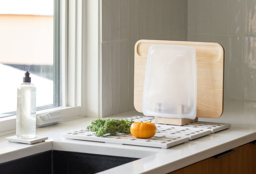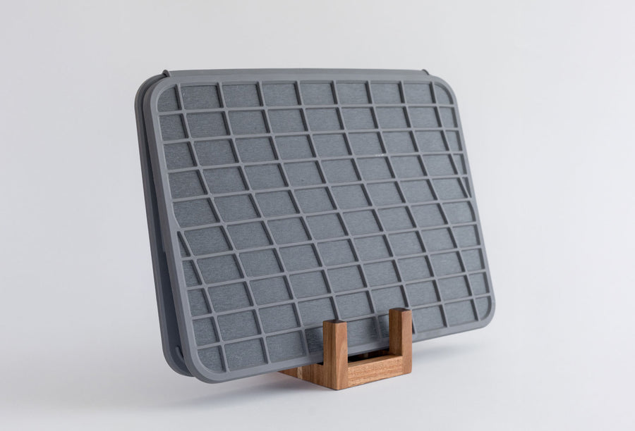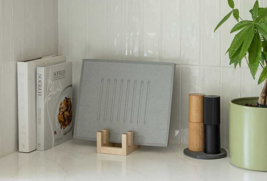 When not in use, the Cutting Board Holder neatly fits your Dorai Dish Pad or Dish Drying Stone, keeping everything organized and within reach. It’s a simple, space-saving way to store your drying setup while maintaining a clean, minimal counter.