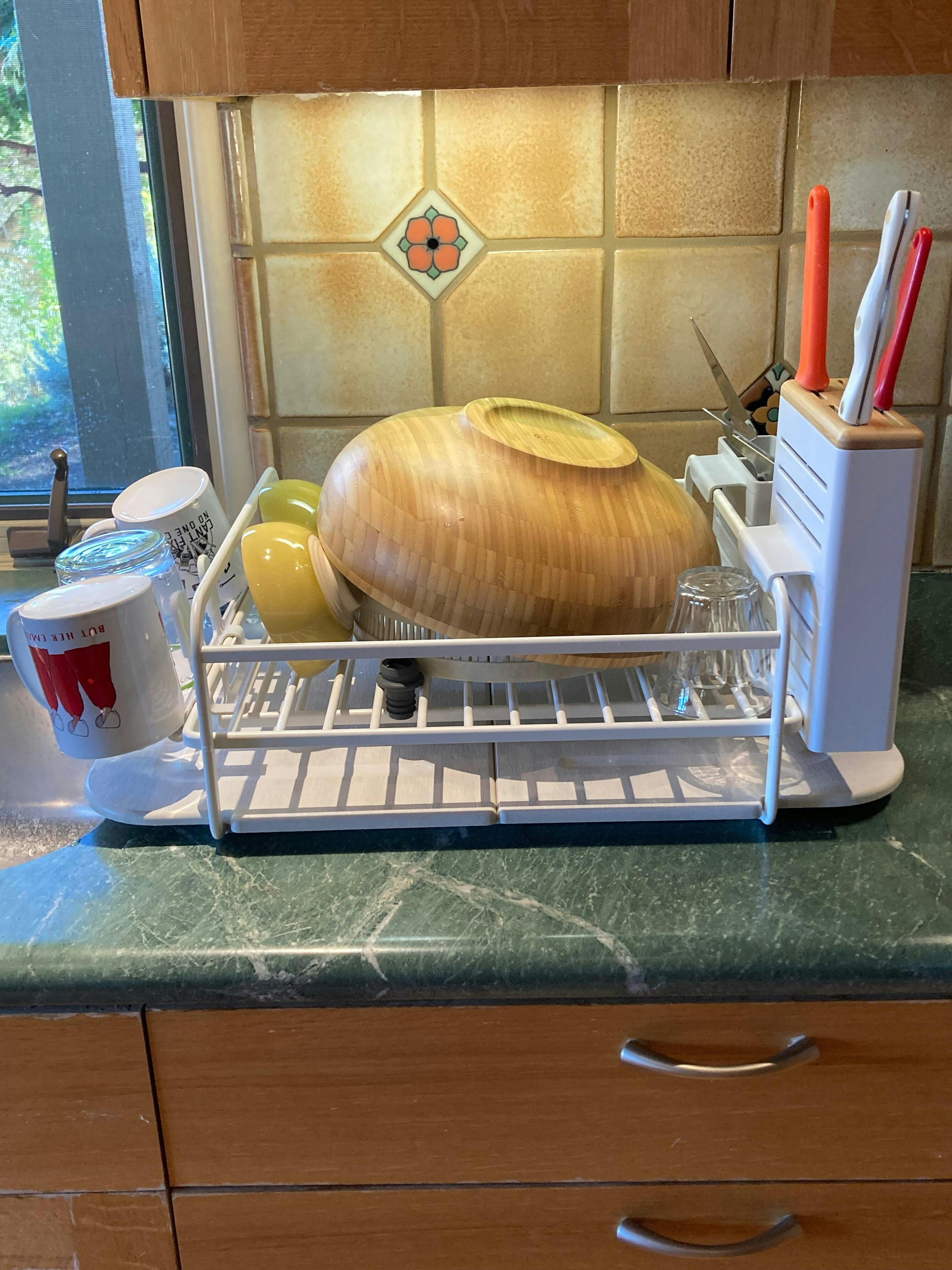 This kitchen drying rack is perfect for power hand washers. It holds 11 plates, 3 large pans, 2 cutting boards, 4 cups, 4 chef’s knives and tons of utensils.