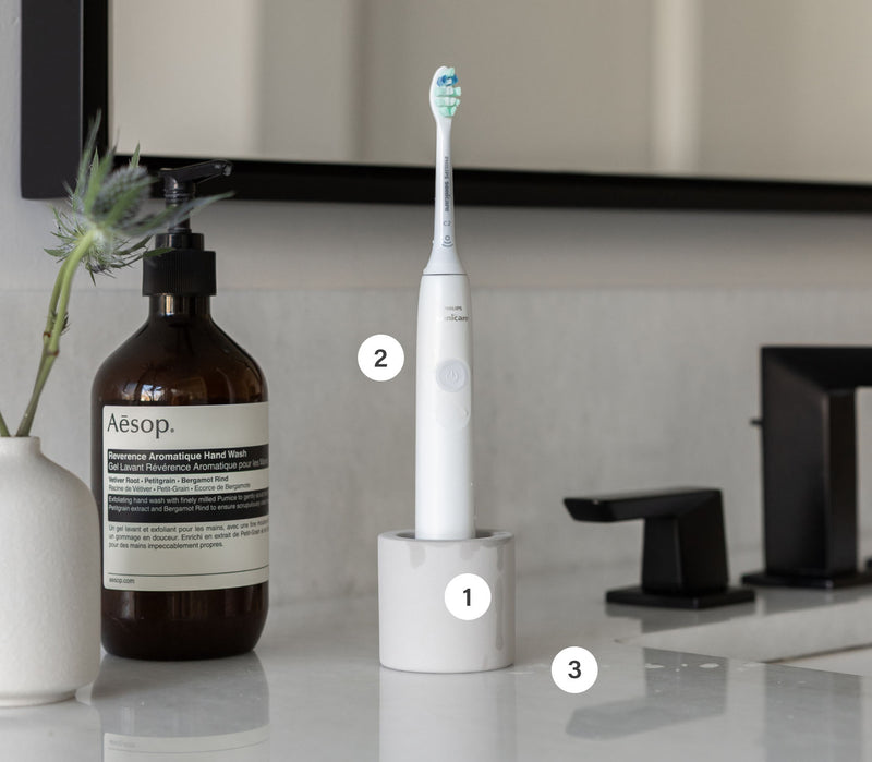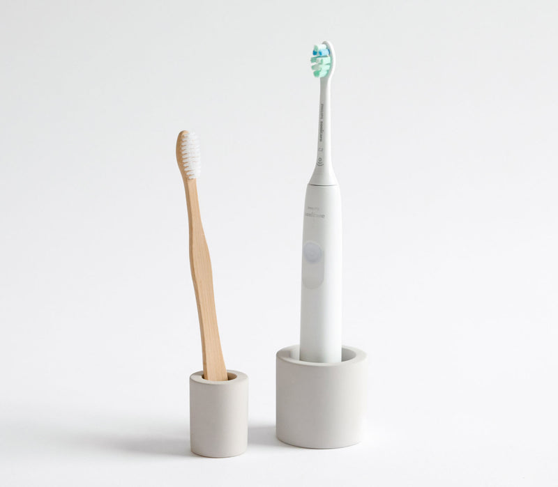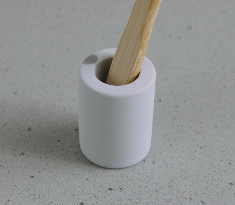 Scrub the Toothbrush Holder with a mild soap and water. For tough stains, dampen the affected area and lightly sand it with a medium-grit sandpaper in a well-ventilated space. Rinse and let the stone dry.