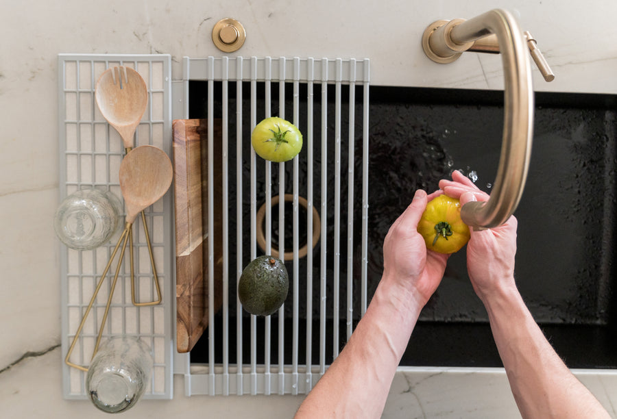 Perfect for small kitchens, the roll-up design of this over-sink dish rack frees up counter space while efficiently drying your dishes. It holds everything from utensils to heavy pots, then rolls away for easy storage when not in use.